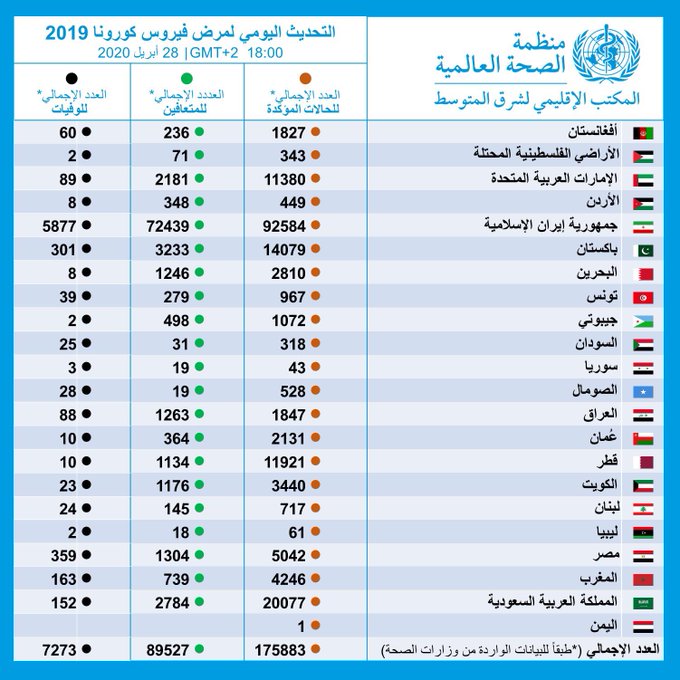 التحديث اليومي لاحصائية المصابين بفيروس كورونا 28 ابريل