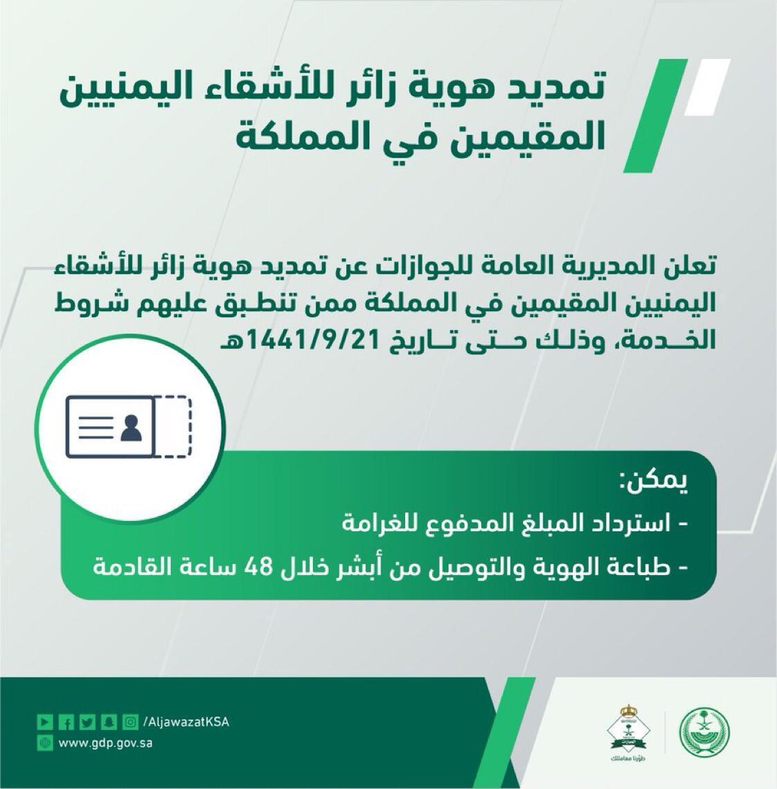 وقالت الجوازات عبر حسابها الرسمي في موقع التواصل الاجتماعي تويتر أن تمديد هوية زائر يشمل المقيمين اليمنيين الذين تنطبق عليهم شروط الخدمة، وذلك حتى تاريخ 21-9-1441هـ.